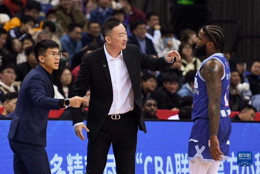 11月15日,青岛国信水产队主教练刘维伟(中)在比赛中指导球员鲍威尔。新华社记者 李紫恒 摄