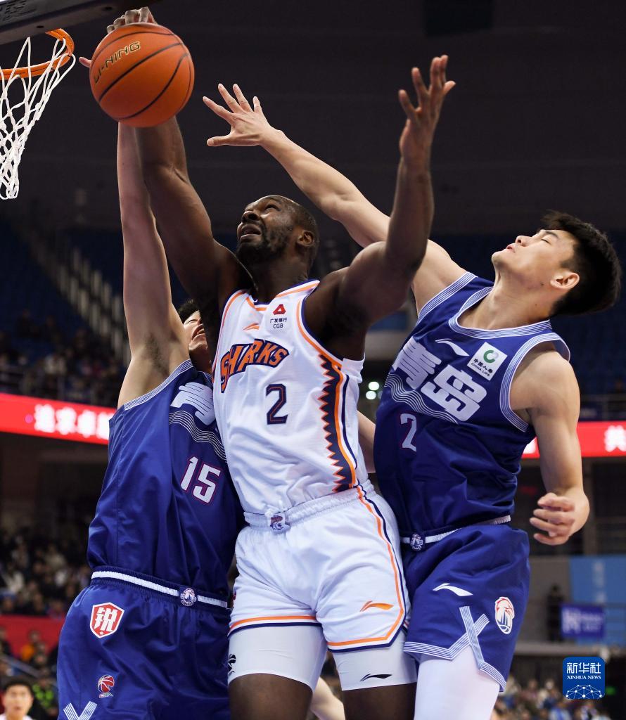 11月15日,上海久事队球员冯莱(中)在比赛中上篮受阻。新华社记者 李紫恒 摄