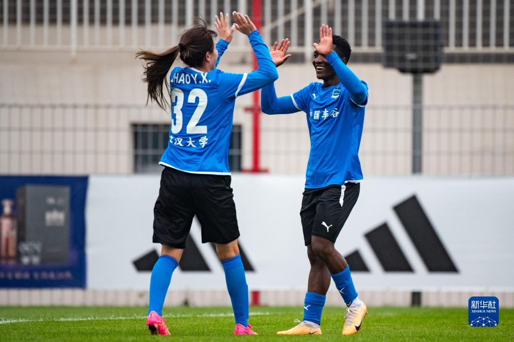 11月15日,武汉车谷江大队球员特姆瓦(右)在进球后庆祝。新华社发(杜子璇摄)
