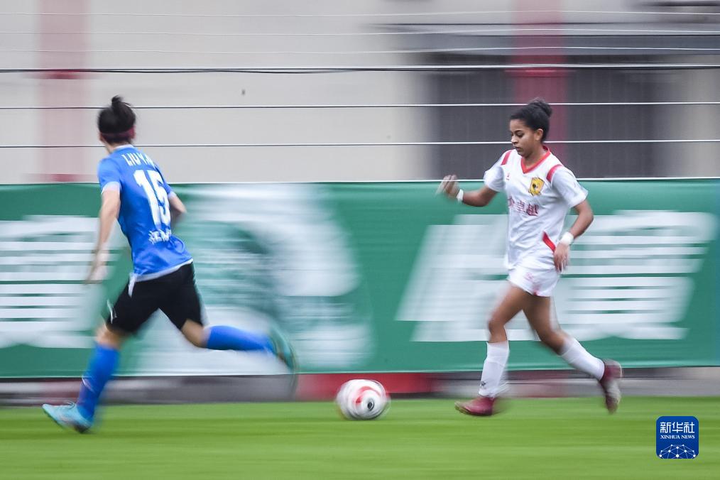 11月15日,长春大众卓越队球员安娜·比阿特丽斯(右)在比赛中带球突破。新华社记者 伍志尊 摄