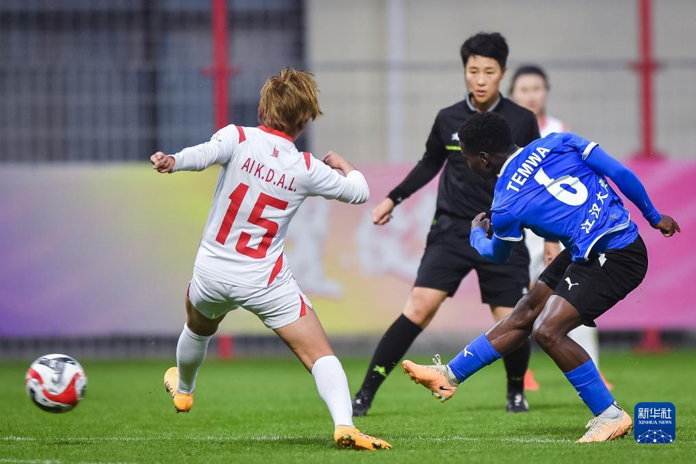 11月15日,武汉车谷江大队球员特姆瓦(右一)在比赛中射门。新华社记者 伍志尊 摄