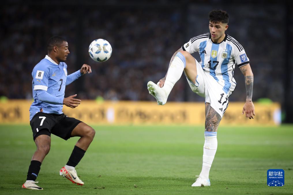 11月16日,阿根廷队球员恩佐·费尔南德斯(右)与乌拉圭队球员德拉克鲁斯在比赛中拼抢。新华社发(马丁·萨巴拉摄)