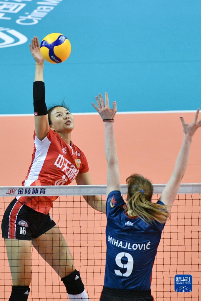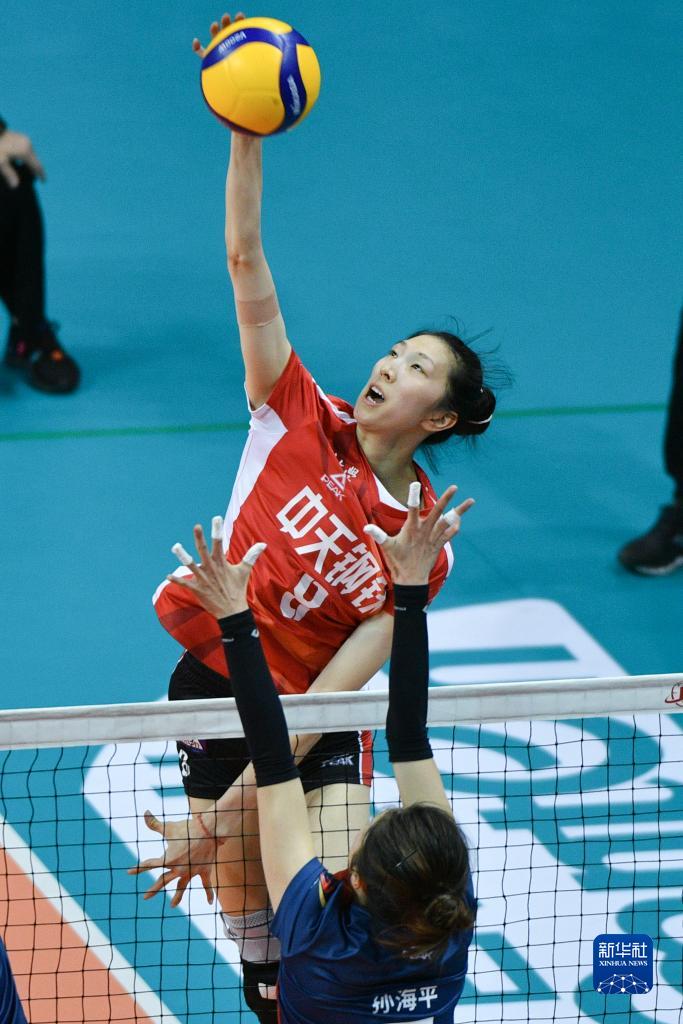 11月18日,江苏中天钢铁队球员吴梦洁(上)在比赛中扣球。新华社发(史康摄)
