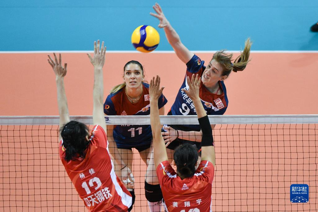 11月18日,辽宁东港草莓队球员米哈伊洛维奇(右上)在比赛中扣球。新华社发(史康摄)