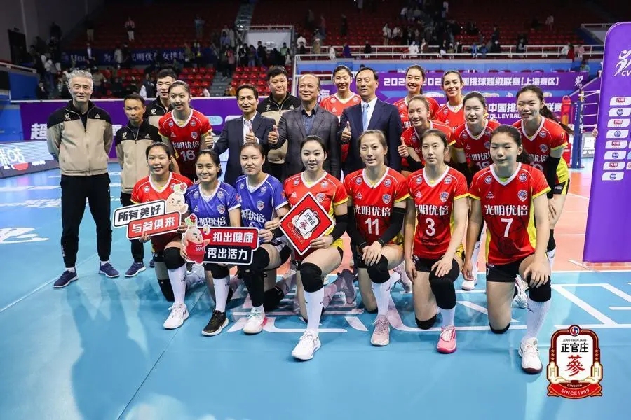发布会后,正官庄领导与上海市排球协会领导共同参与开球仪式,并一同观看了上海光明优倍女排与广东台山和力女排的比赛。最终,上海女排以3比0战胜广东女排。