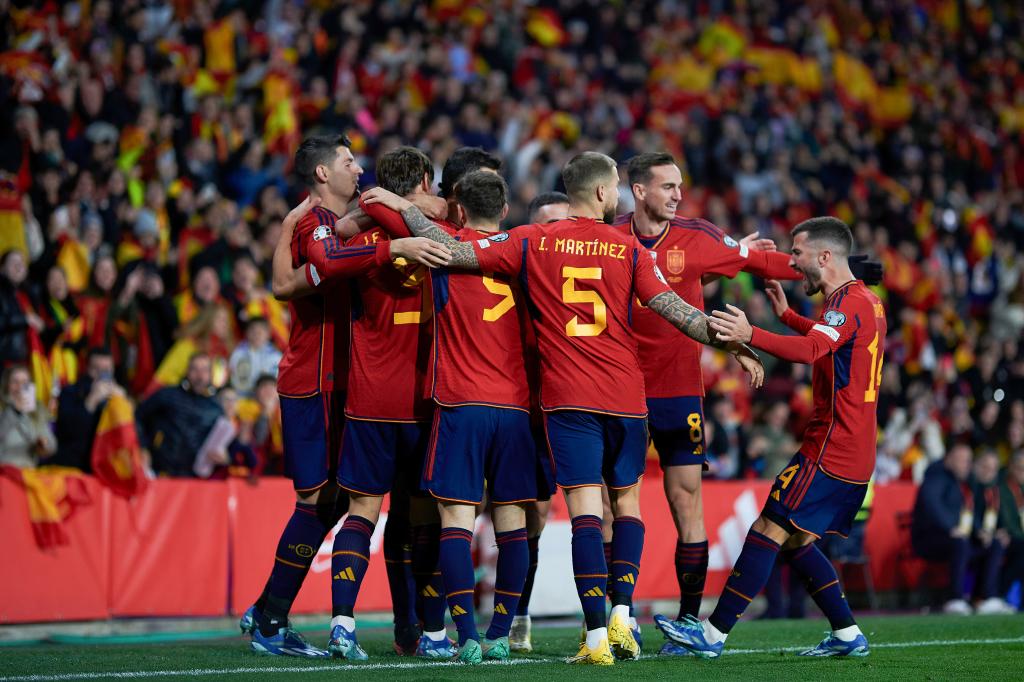 A组较量中,西班牙队主场3:1战胜格鲁吉亚队。开场4分钟,勒诺尔芒头球攻门得手。第10分钟,客队的克瓦拉茨赫利亚弧顶处低射扳平比分。下半时费兰·托雷斯头球建功为主队再入一球,客队防守球员洛乔什维利头球解围失误加送一粒乌龙。同组的苏格兰队3:3战平挪威队。