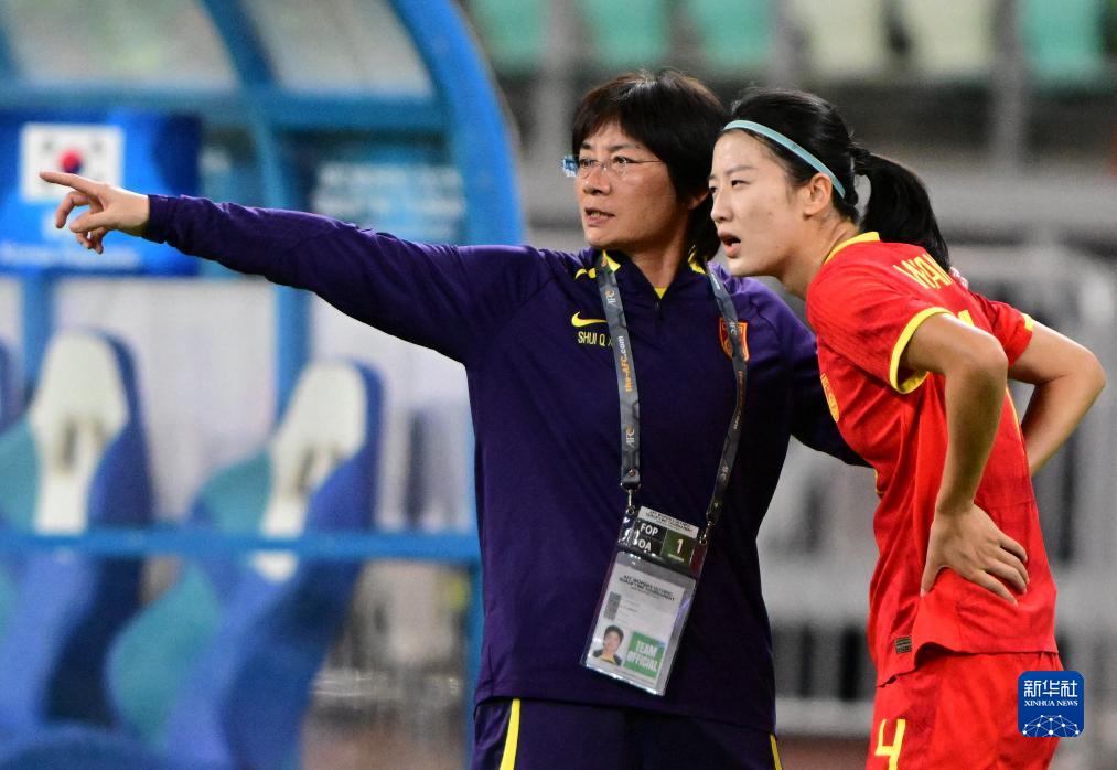 2023年11月1日,在厦门举行的巴黎奥运会女足预选赛亚洲区第二阶段(B组)最后一轮比赛中,中国队主教练水庆霞(左)指导球员汪琳琳。中国队以1比1战平韩国队,无缘晋级巴黎奥运会。新华社记者 魏培全 摄