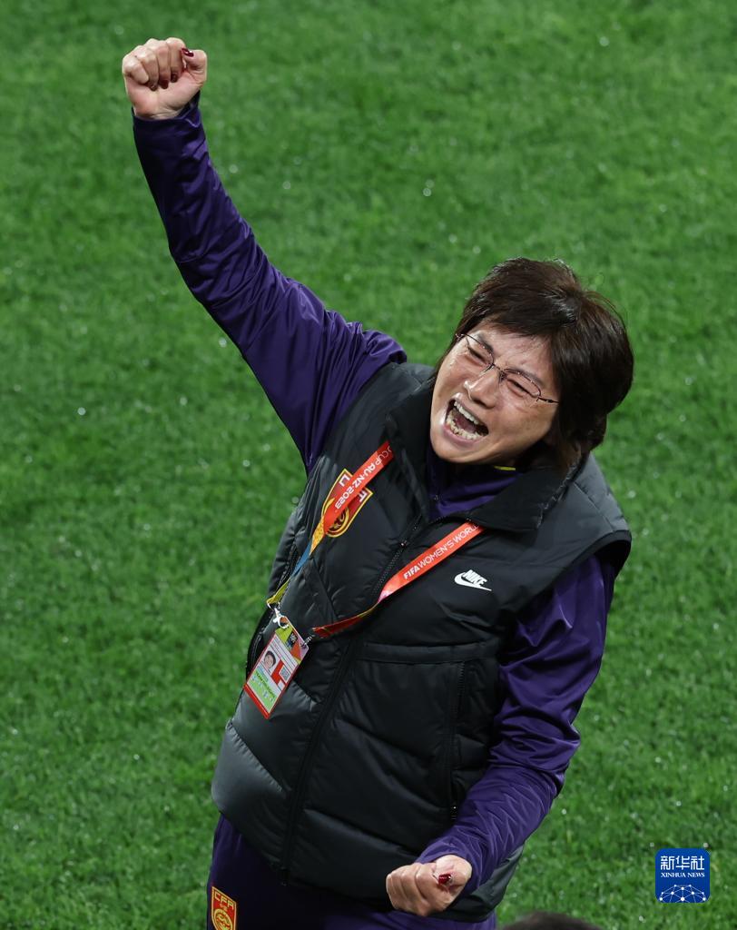 2023年7月28日,中国队主教练水庆霞在澳大利亚阿德莱德举行的2023年国际足联女足世界杯D组对阵海底队的比赛后庆祝胜利。中国队以1比0战胜海地队。新华社记者 丁汀 摄