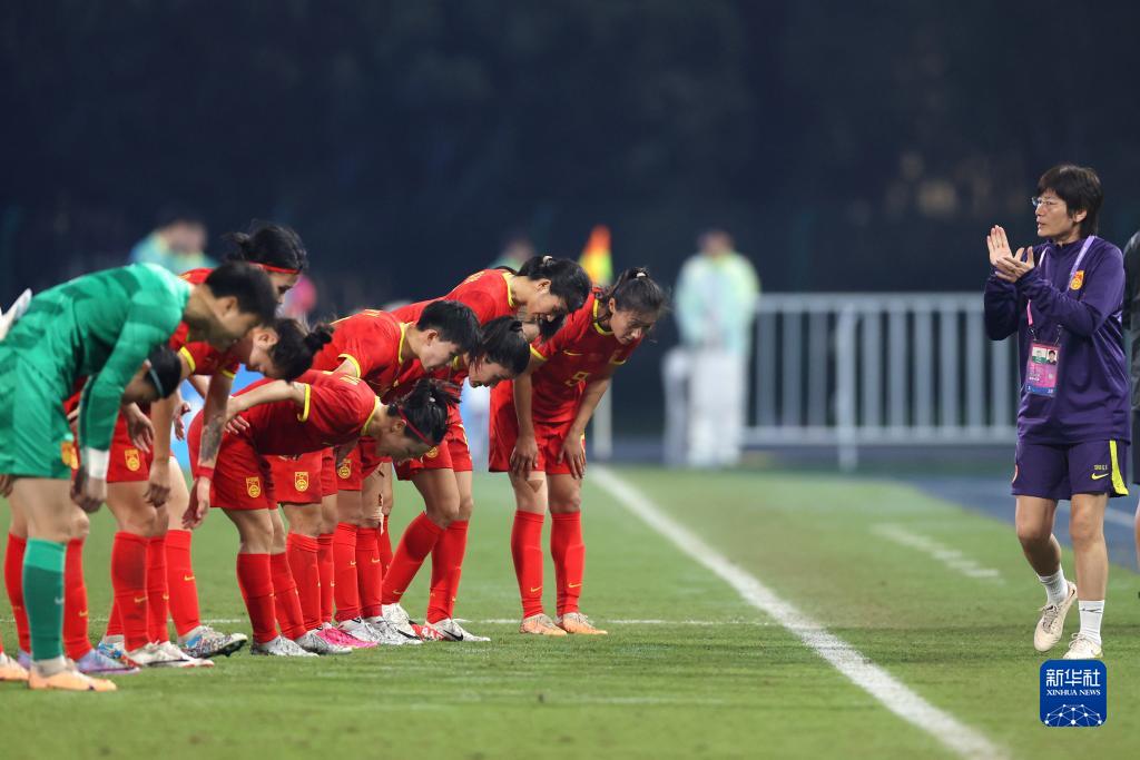 2023年9月22日,在杭州亚运会足球项目女子组小组赛A组比赛后,中国队球员向主教练水庆霞(右一)鞠躬致意。中国队以16比0战胜蒙古国队。新华社记者 贾浩成 摄