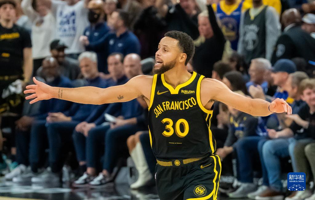 11月20日,勇士队球员库里在比赛中庆祝得分。新华社发(董旭东摄)