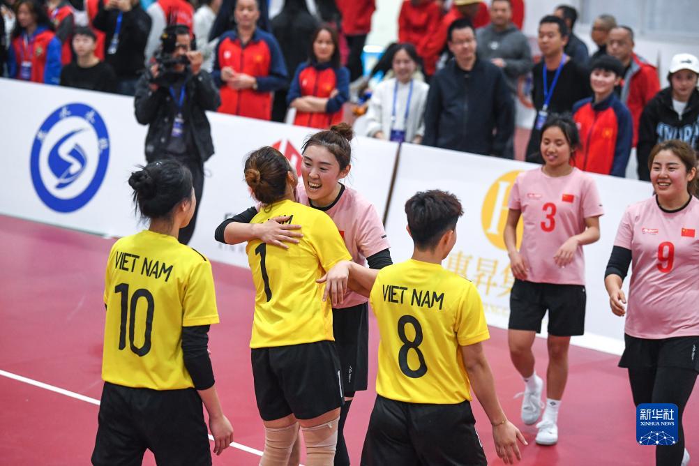 11月21日,中国队球员(右)与越南队球员在单组赛女子组决赛后拥抱致意。新华社发(肖伟摄)