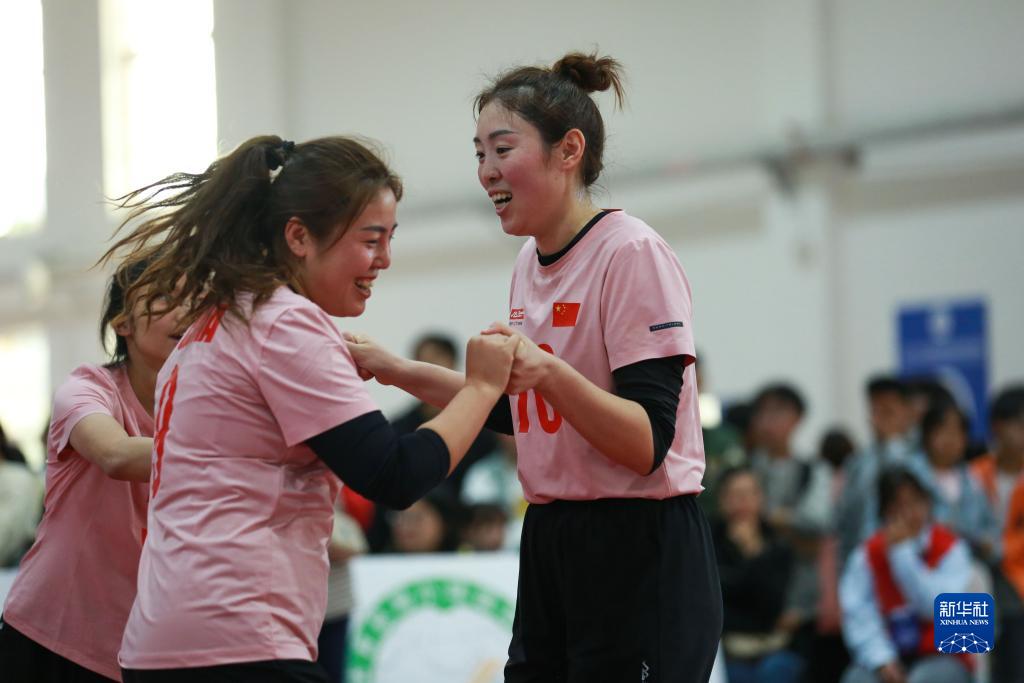 11月21日,中国队选手崔永辉(右)和队友在单组赛女子组决赛中庆祝得分。新华社发(肖伟摄)