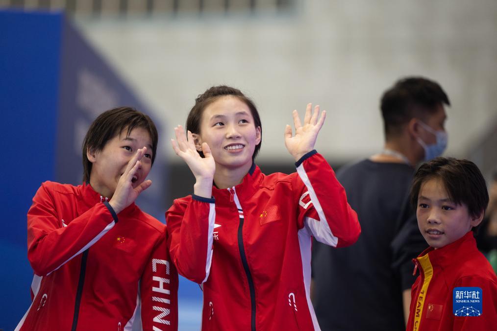 11月22日,上海队选手陈芋汐(中)、广东海印队选手全红婵(左)、广东海印队选手蒋林静在比赛后。新华社记者 肖艺九 摄