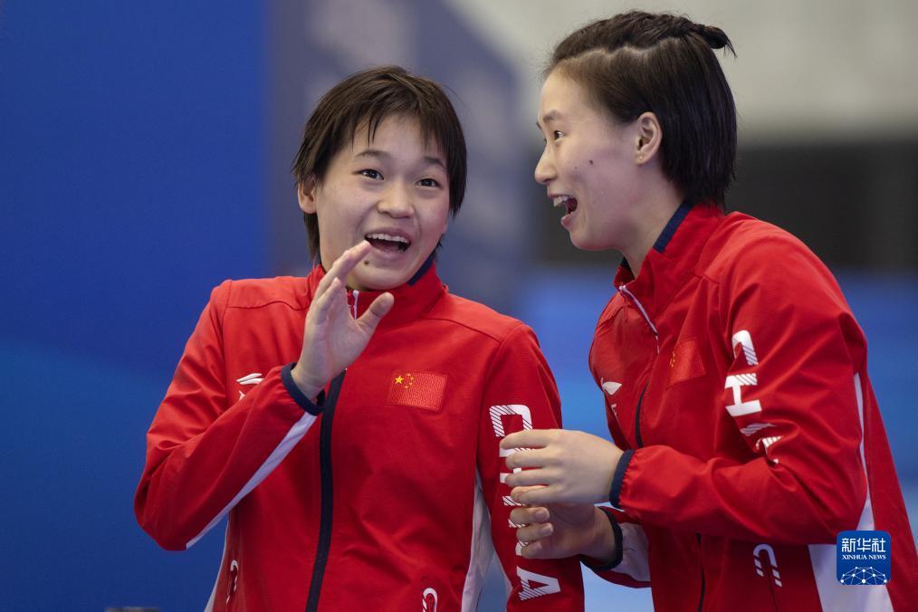 11月22日,上海队选手陈芋汐(右)、广东海印队选手全红婵在比赛后。新华社记者 肖艺九 摄