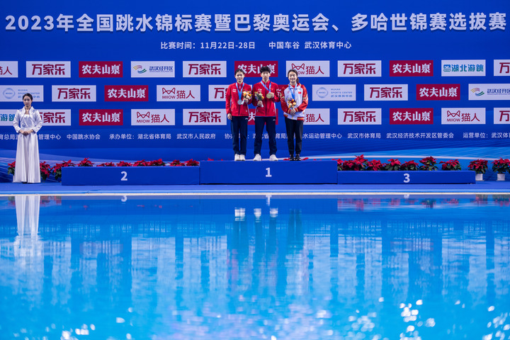 11月23日,女子1米板前三名选手在颁奖仪式上。新华社记者伍志尊摄