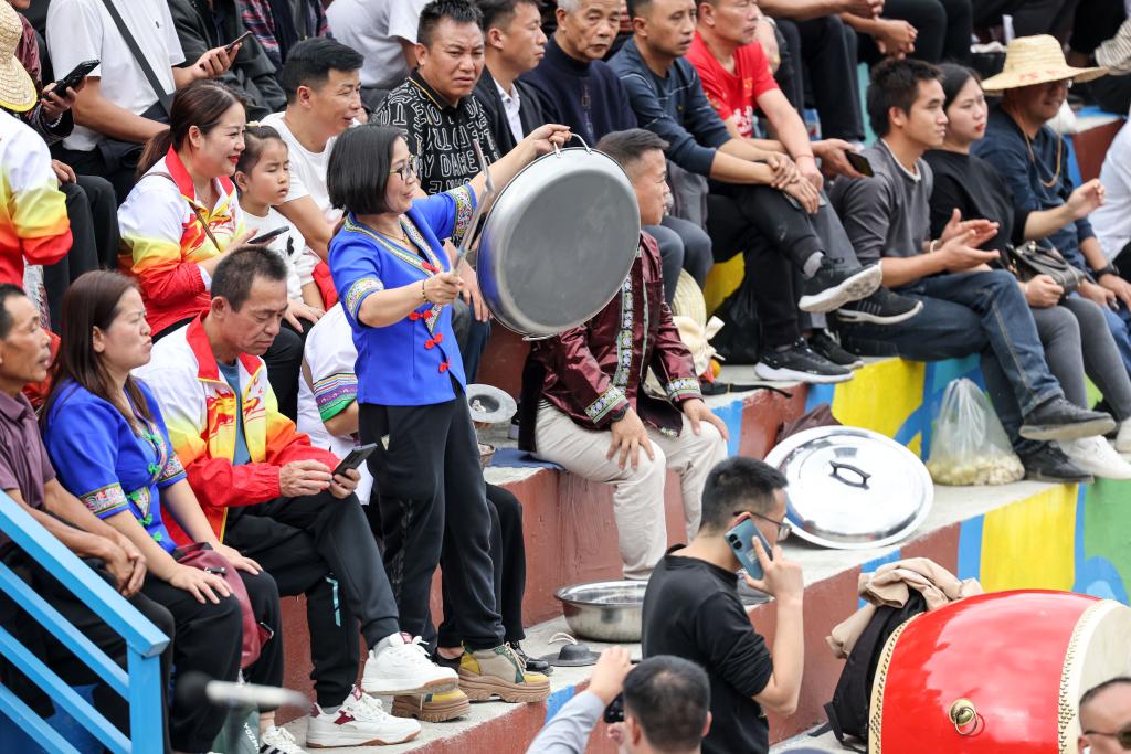观众在看台上敲铁锅助威(2023年10月25日摄)。新华社记者 欧东衢 摄