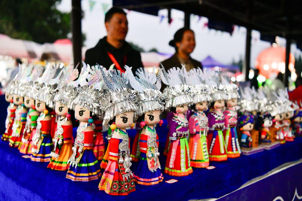 当地群众在台盘乡球场旁搭建的非遗集市上销售文创产品(2023年10月27日摄)。新华社记者 杨文斌 摄