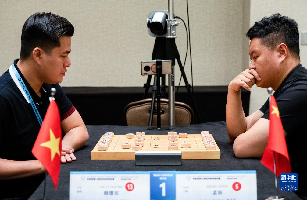 11月24日,中国棋手孟辰(左)和越南棋手赖理兄在决赛中。新华社发(陈晨摄)