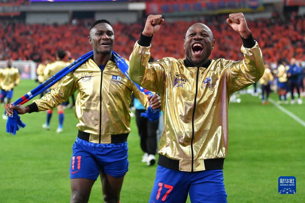 11月25日,上海申花队球员巴索戈(右)与队友马莱莱庆祝夺冠。