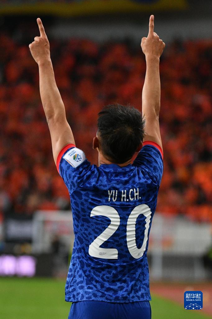 11月25日,上海申花队球员于汉超在比赛中庆祝得分。