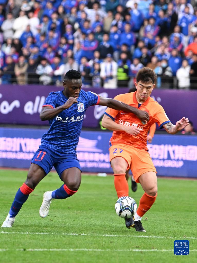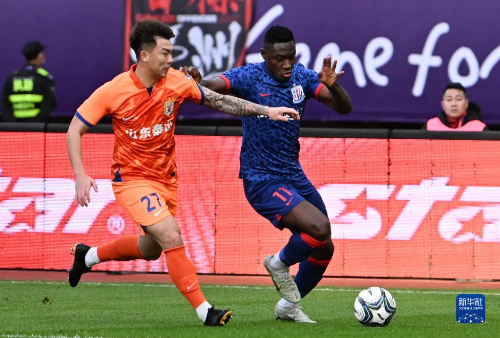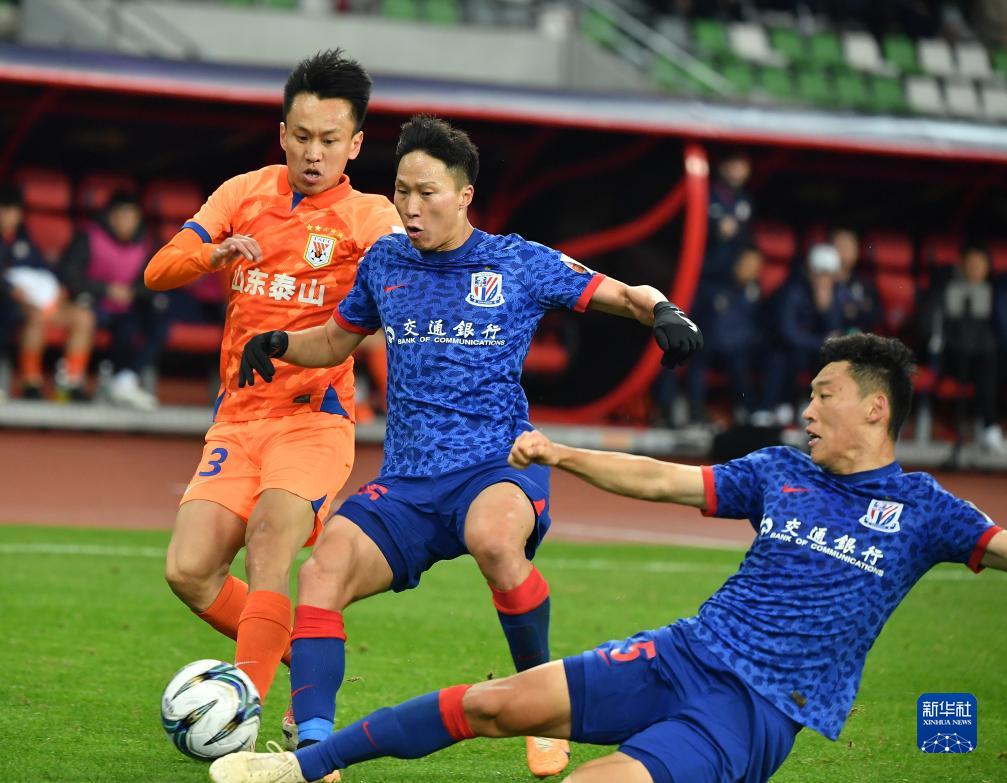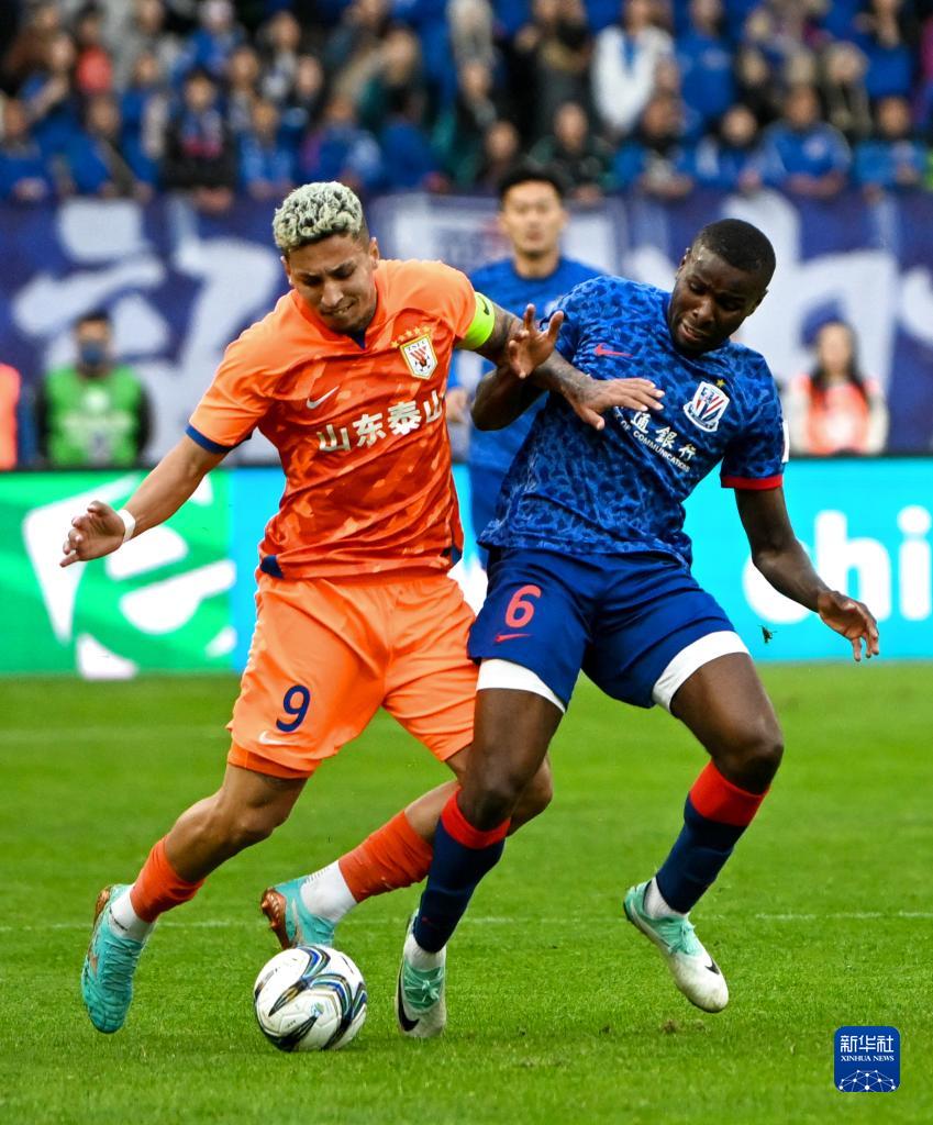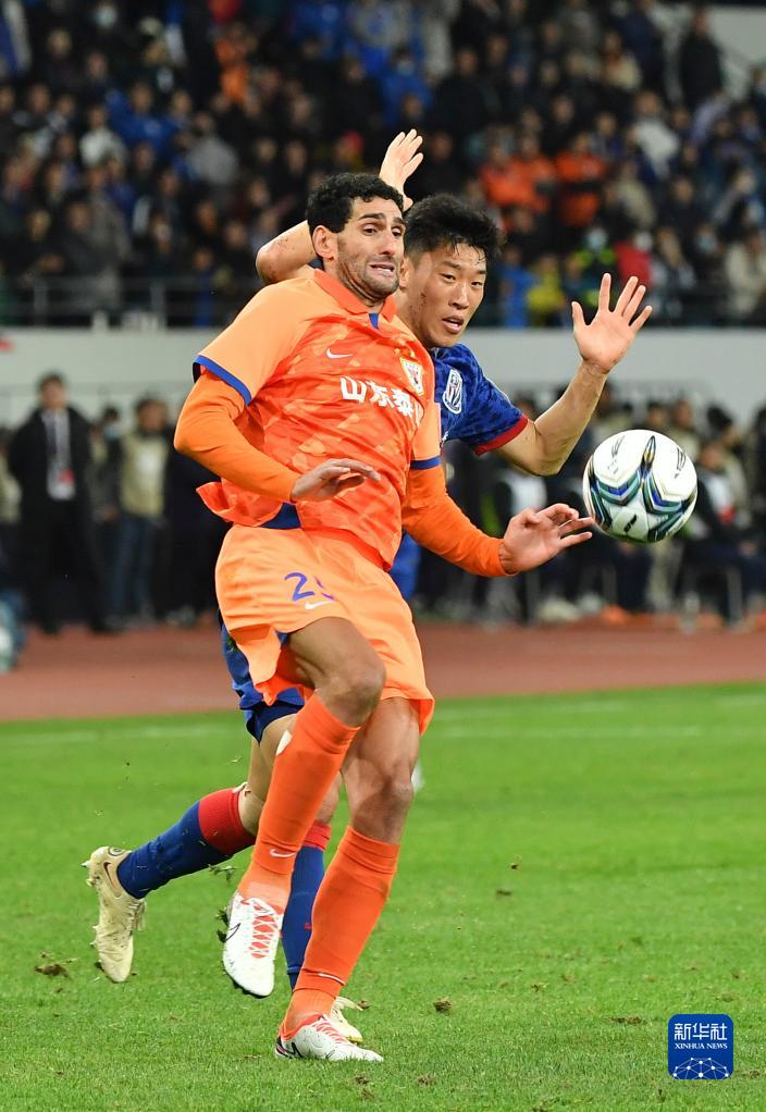 11月25日,上海申花队球员徐皓阳(右)和山东泰山队球员廖力生在比赛中拼抢。