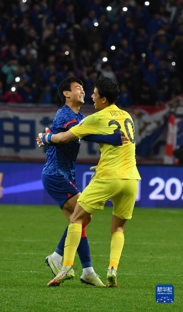 11月25日,上海申花队守门员鲍亚雄(右)与队友张威在赛后庆祝胜利。