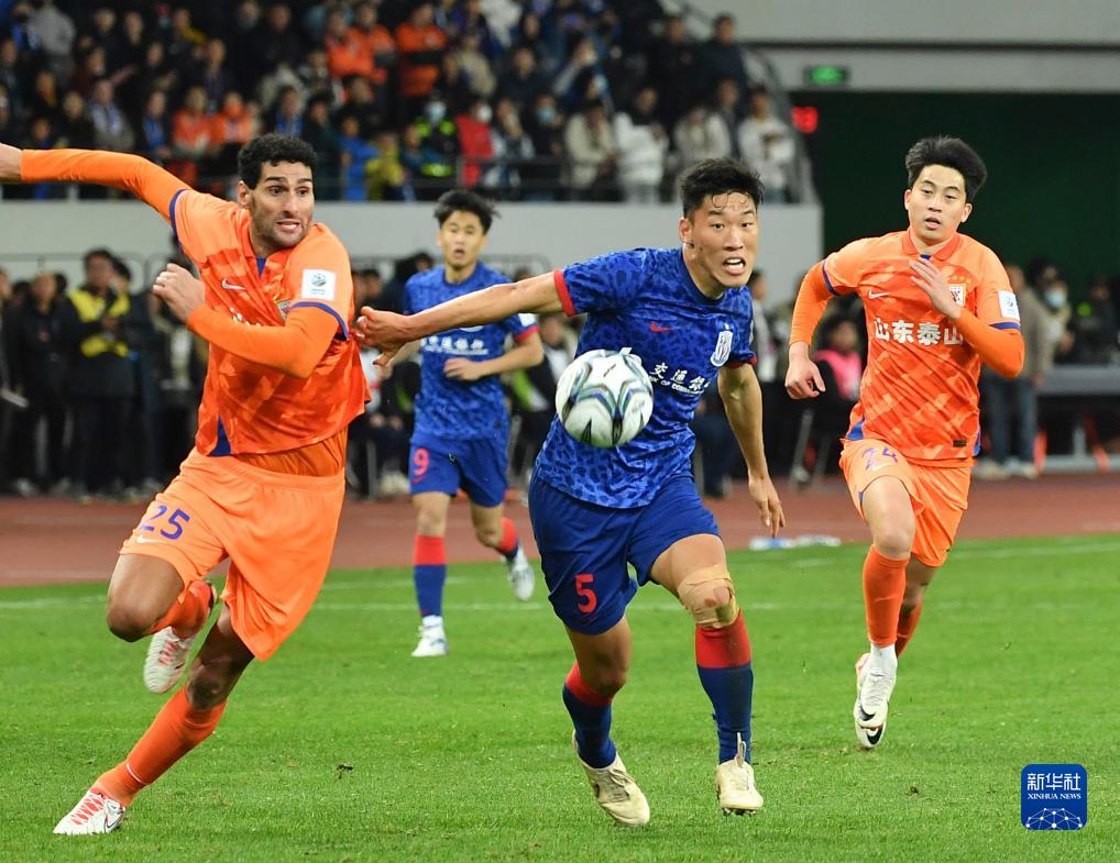 11月25日,上海申花队球员朱辰杰(右二)与山东泰山队球员费莱尼(左一)在比赛中拼抢。