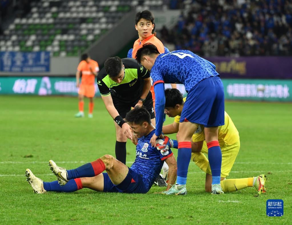 11月25日,上海申花队球员朱辰杰(下)在比赛中受伤。