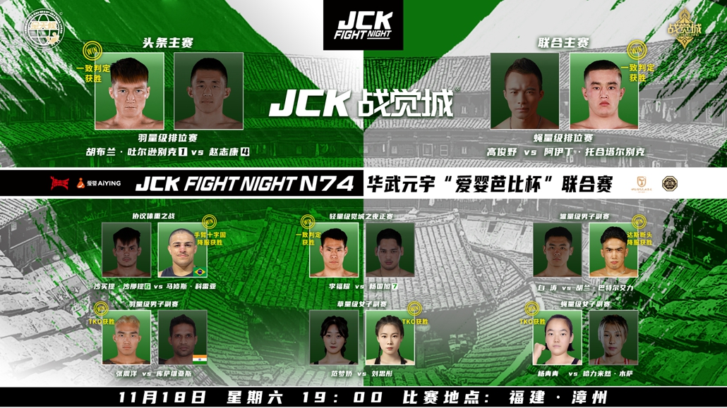 2023年11月18日,JCK战觉城历史首场联合赛——JCK觉城之夜第74期“纵横四海”来到福建漳州,头条主赛胡布兰·吐尔逊别克一致判定胜赵志康、联合主赛阿伊丁·托合塔尔别克一致判定胜高俊野、正赛马修斯·科雷亚手臂十字固降服沙买提·沙那提、李福耀一致判定胜杨国旭,副赛对决胡兰·巴特尔艾力达斯断头降服白涛、张震洋TKO库萨维亚斯、刘思彤TKO范梦娇、杨青青TKO哈力米然·木萨。