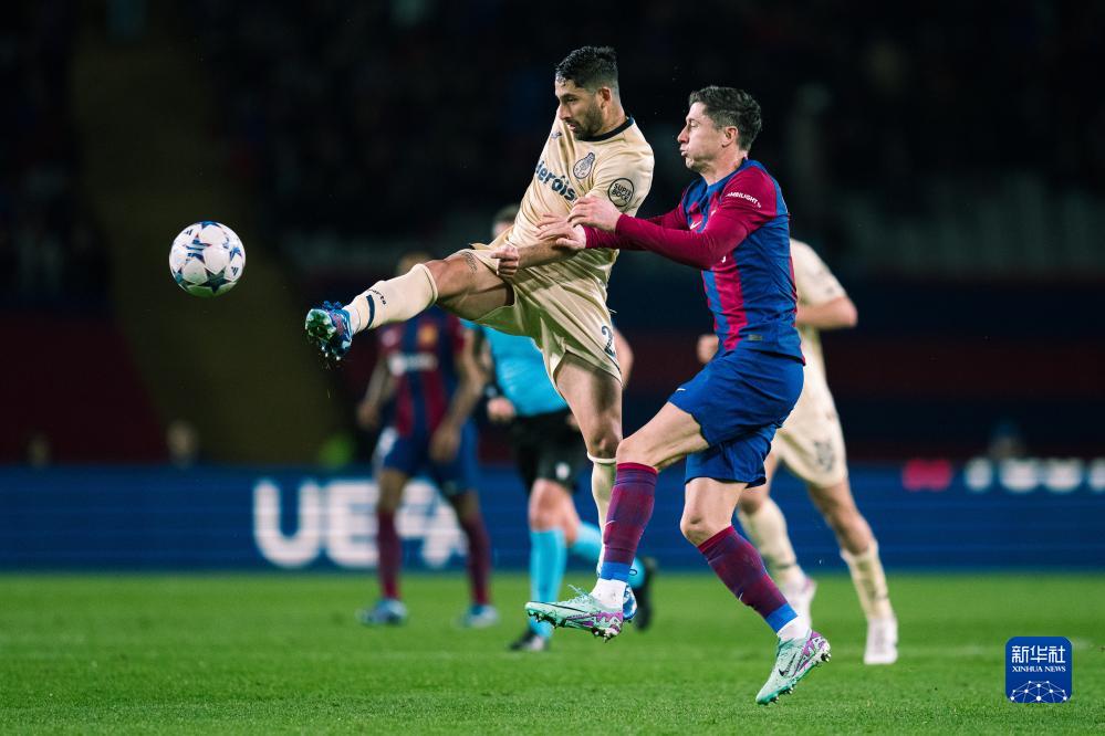 11月28日,巴塞罗那队球员莱万多夫斯基(右)与波尔图队球员瓦雷拉在比赛中拼抢。新华社发(胡安·戈萨摄)