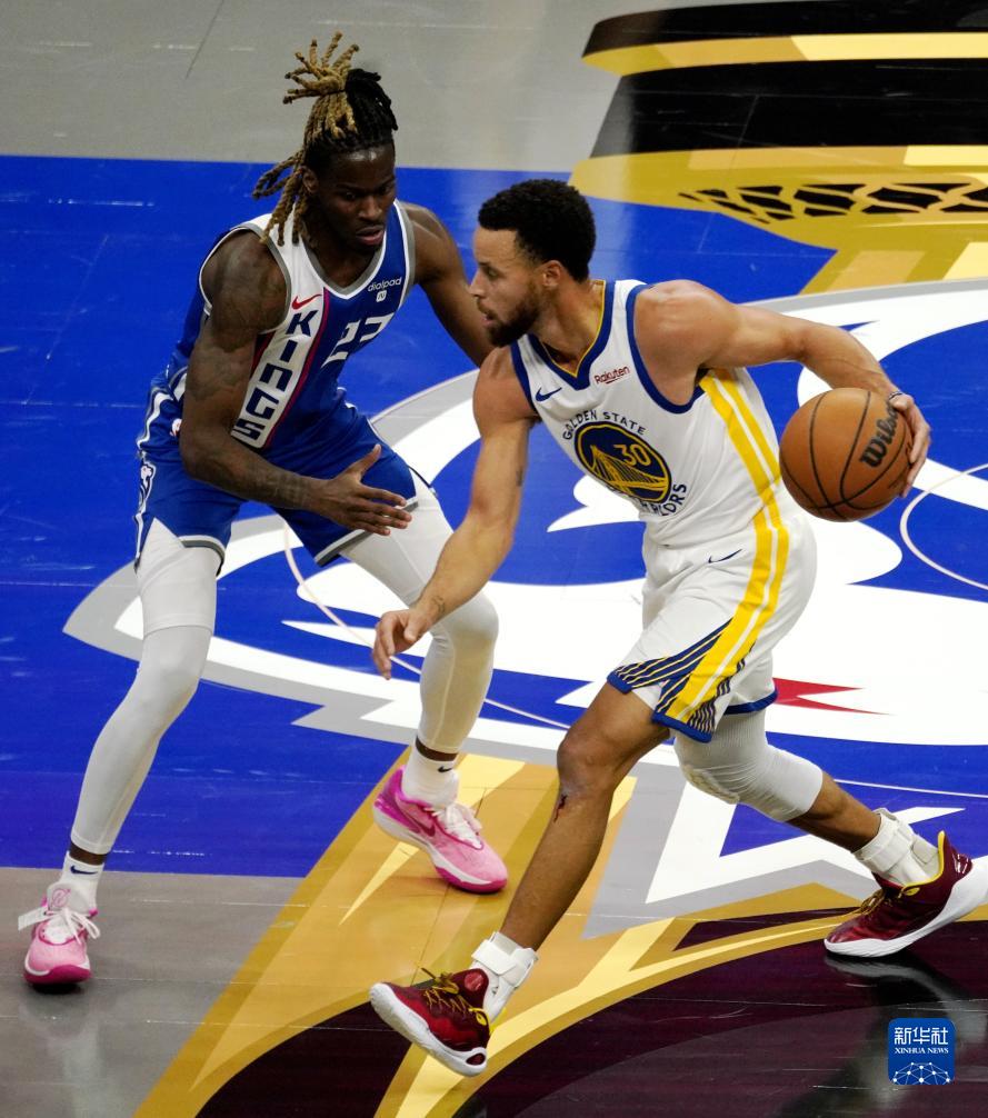 11月28日,勇士队球员库里(右)在比赛中防守国王队球员福克斯。新华社记者 吴晓凌 摄