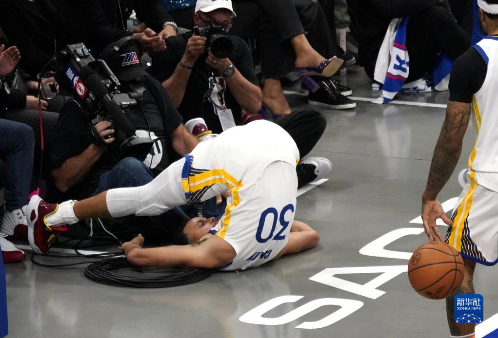 11月28日,勇士队球员库里在比赛中上篮后摔倒。新华社记者 吴晓凌 摄