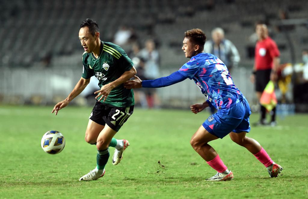 11月29日,香港杰志队球员罗梓骏(右)防守全北现代队球员文宣民。新华社记者 卢炳辉 摄