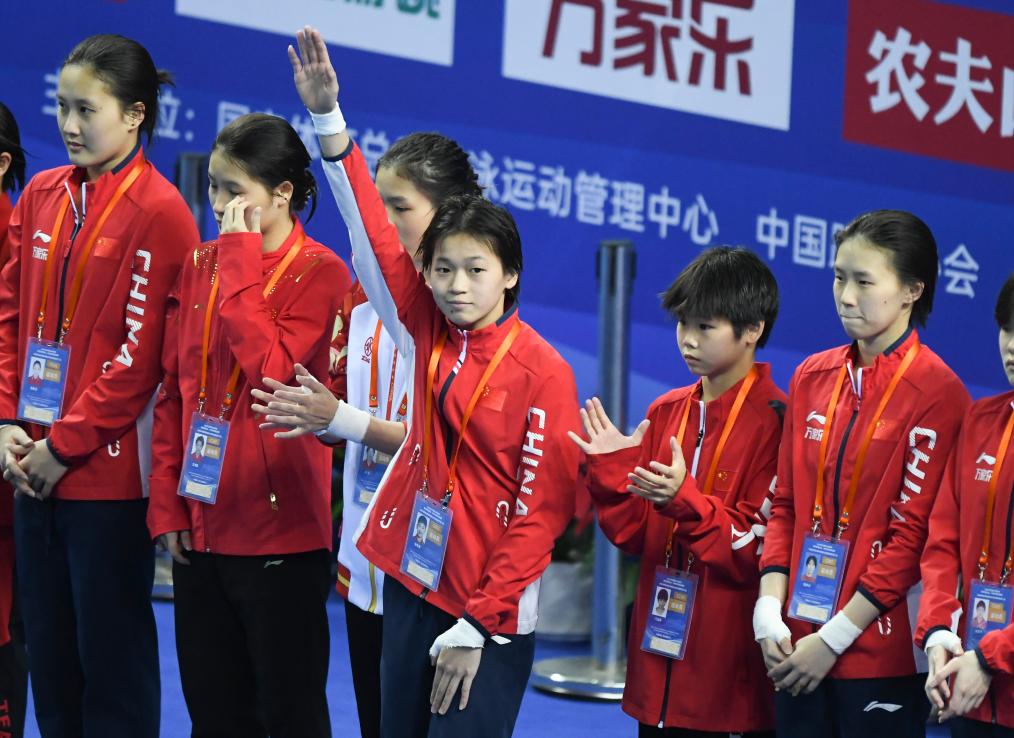 12月1日,全红婵(左四)在比赛前向观众致意。新华社记者 程敏 摄