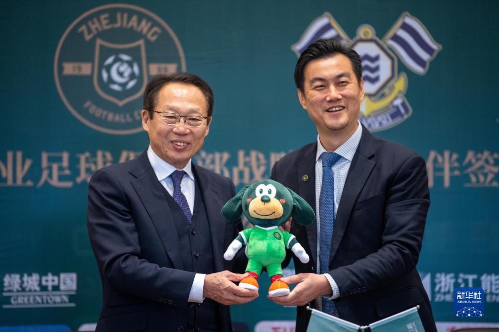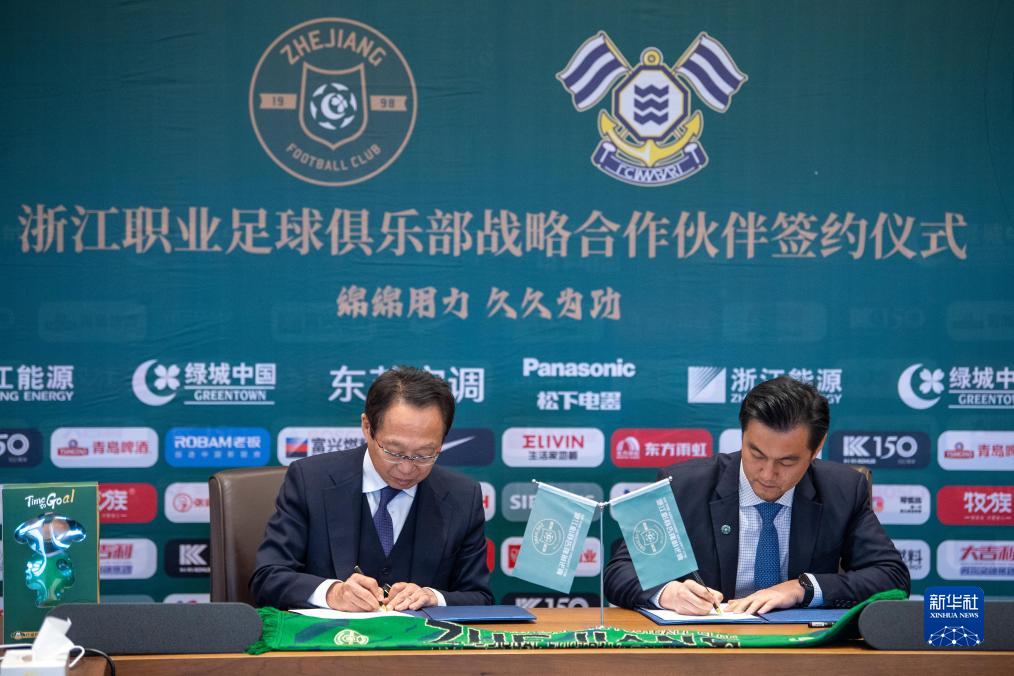 12月4日,日本今治足球俱乐部投资人冈田武史(左)与浙江职业足球俱乐部总经理焦凤波在签约仪式上。新华社记者 江汉 摄