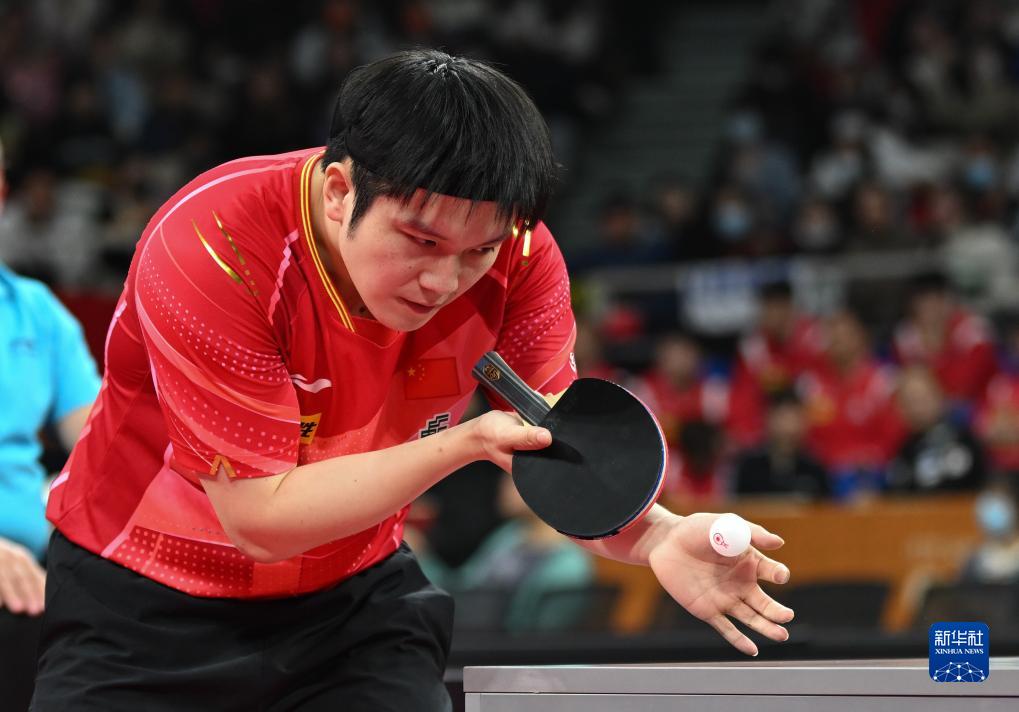 12月5日,中国队选手樊振东在男单比赛中发球。他以2比0战胜中国香港队选手黄镇廷。新华社记者 胥冰洁 摄