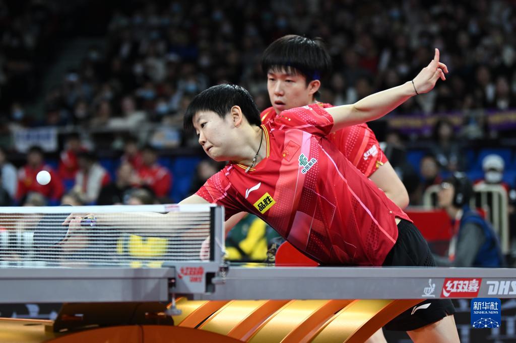 12月5日,中国队组合王楚钦/孙颖莎(右)在混双比赛中。他们以3比0战胜中国香港队组合杜凯琹/何钧杰。新华社记者 胥冰洁 摄