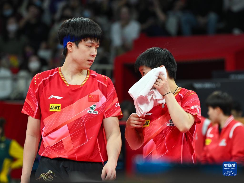 12月5日,中国队组合王楚钦(左)/孙颖莎在比赛间隙交流。他们以3比0战胜中国香港队组合杜凯琹/何钧杰。新华社记者 胥冰洁 摄