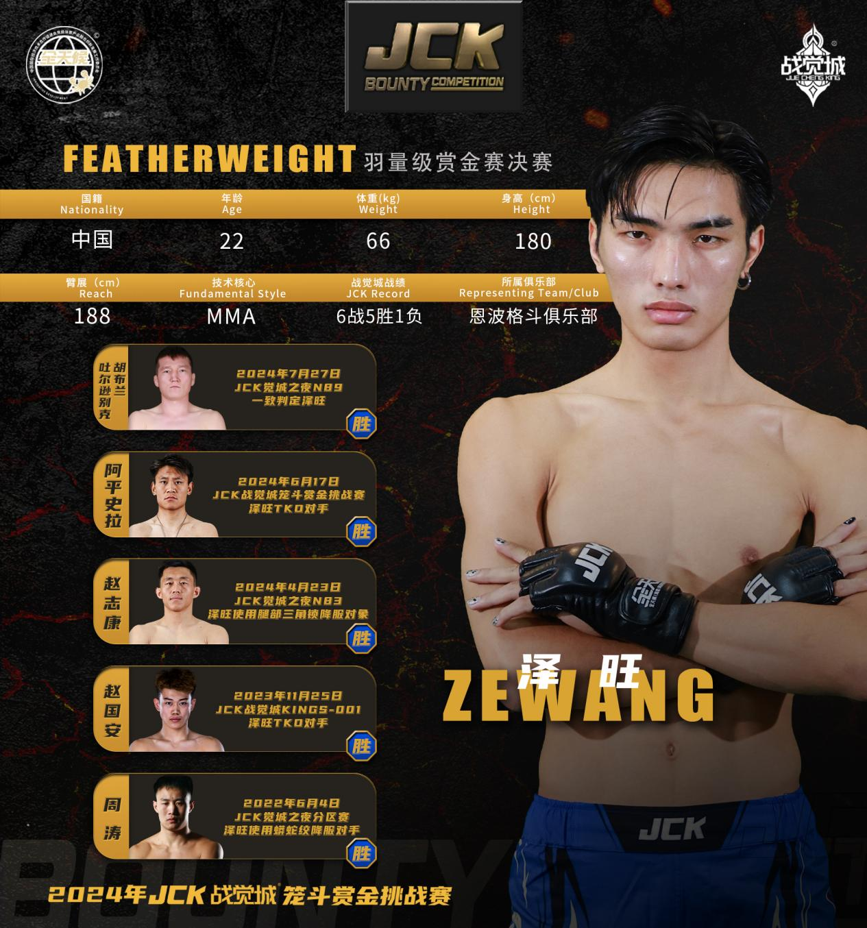 泽旺,JCK战觉城羽量级官方排名第五,是羽量级人气最高的选手,他目前在JCK战觉城6战5胜。