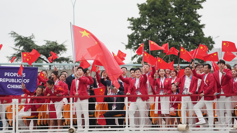 中国体育代表团旗手、花样游泳选手冯雨在开幕式上挥舞国旗