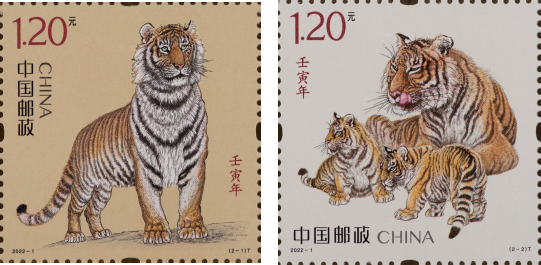 《壬寅年》特种邮票是中国生肖邮票第四轮中的第七套,由画家冯大中创作。第一枚名为“国运昌隆”,设计了一只矗立远眺、气宇轩昂的上山虎形象;第二枚名为“虎蕴吉祥”,描绘了面容温婉的虎妈妈带着两只虎仔悠然休憩的温馨场景。