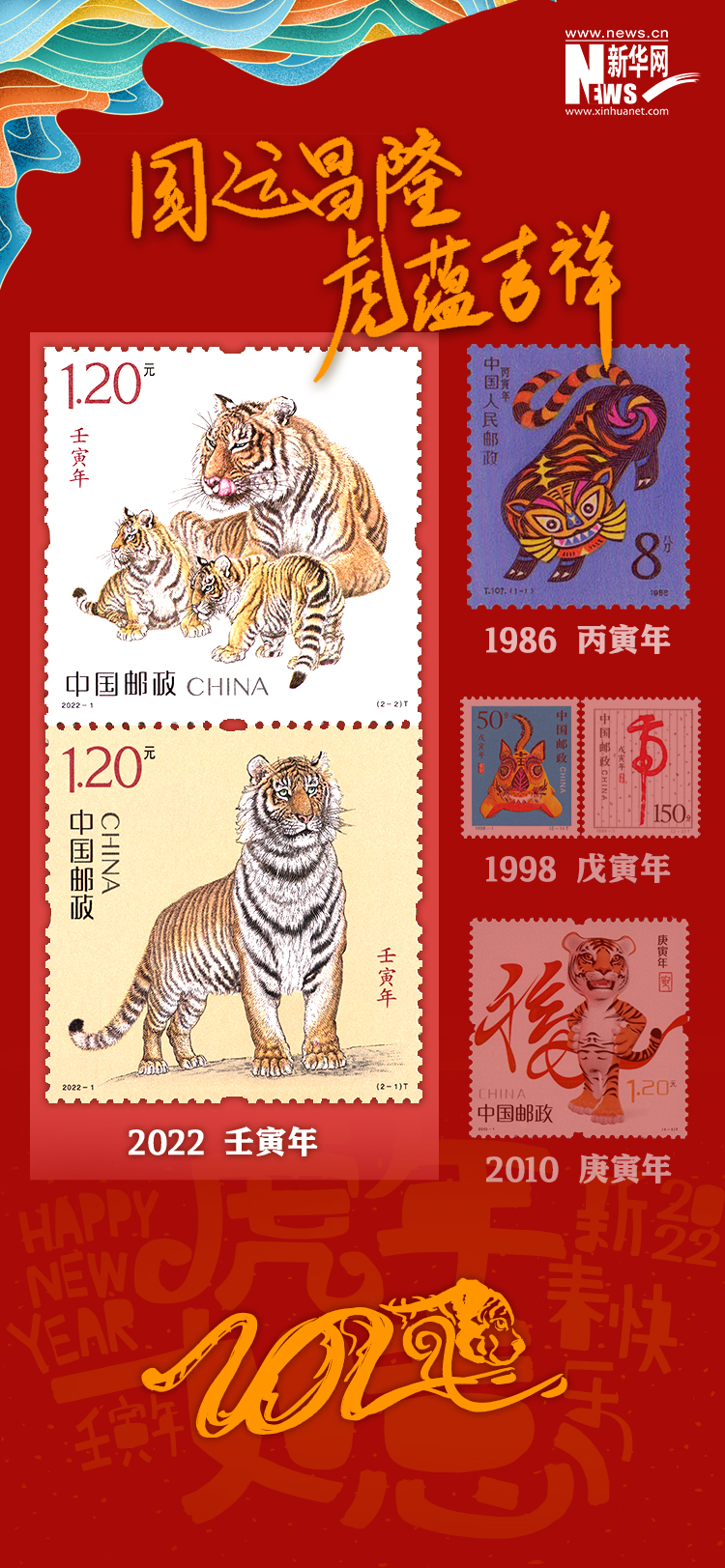 2022年1月5日,《壬寅年》特种邮票首发仪式在中国国家博物馆隆重举行。这是自1980年以来,中国邮政连续42年发行生肖邮票。今年生肖邮票1套2枚,全套邮票面值为2.40元。