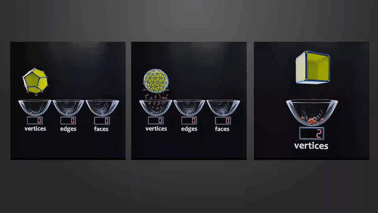 以欧拉多面体公式V-E+F=2为例,袁亚湘介绍,不管是立方体、四面体、八面体,还是你设计的任何多面体,它的顶点数(V)、棱边数(E)和面数(F)一定满足“V-E+F=2”这个关系式。