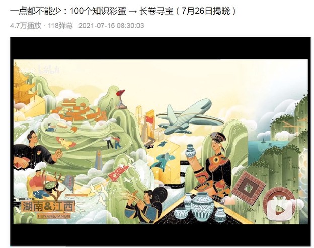 “长卷寻宝”由24幅画卷组成,每幅画卷对应着一个民族地区,被网友称为“新千里江山图”。随着这幅长卷徐徐展开,用户可以沉浸到祖国的自然风光和人文景观之中,于方寸屏幕中便能领略祖国的壮美山河,体会祖国的发展进步。画卷细节处埋藏了100个知识彩蛋,只需轻轻点击屏幕便可触发,这其中有建党百年的光辉历史、有民族文化的深远传承,更有扶贫攻坚的动人故事。
