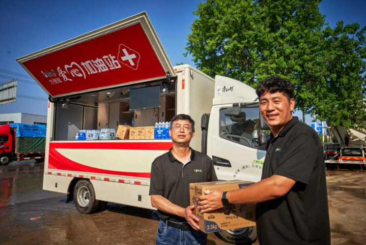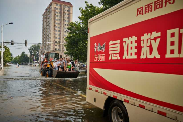 7月22日晚,河南新乡暴雨成灾,卫河决堤,被困人员不断增加,情况十分危急,急需救援力量。康师傅了解到该信息后,立即在包括新乡、安阳、周口、鹤壁等重灾区加大物资救助力度,康师傅支援行动指挥部于24日紧急抽调在郑州市区进行救助的急难救助车,一路赶往新乡。7月24日上午11点,随着第一碗热腾腾的红烧牛肉面端出锅,康师傅的“爱心加油站”渐渐成了抗洪一线的温情食堂,为上万名救灾一线人员和受困群众亮起了一盏暖暖的灯,这才有了本文开头的感人一幕。
