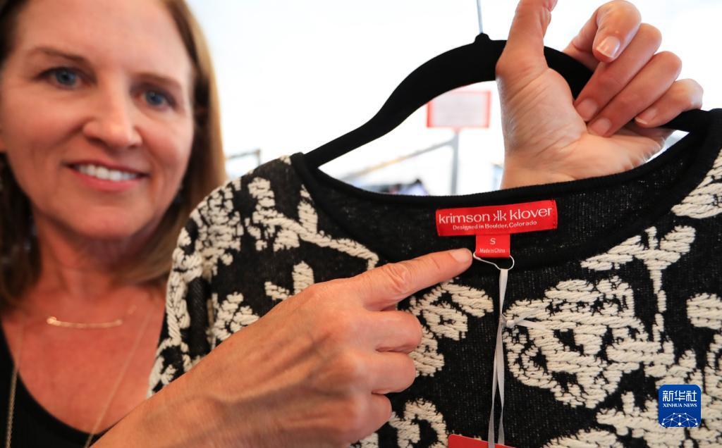2019年9月12日,在美国科罗拉多州博尔德,克里姆森-克洛弗公司创始人兼首席执行官朗达·斯温森展示中国制造的衣服的标签。新华社记者 李颖 摄