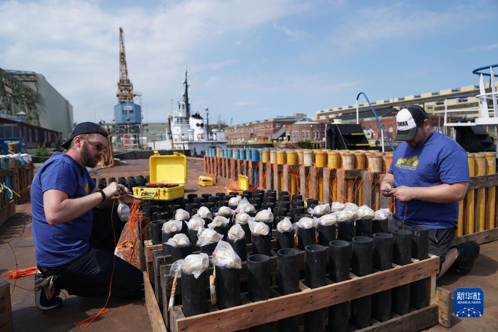 2019年5月25日,工作人员在美国宾夕法尼亚州费城一处码头安装产自中国湖南浏阳的烟花,为当晚美国阵亡将士纪念日的烟花表演做准备。新华社记者 刘杰 摄