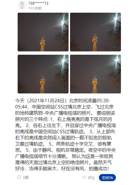神十二乘组进驻空间站后的第三天,首次尝试拍摄空间站过境轨迹。
