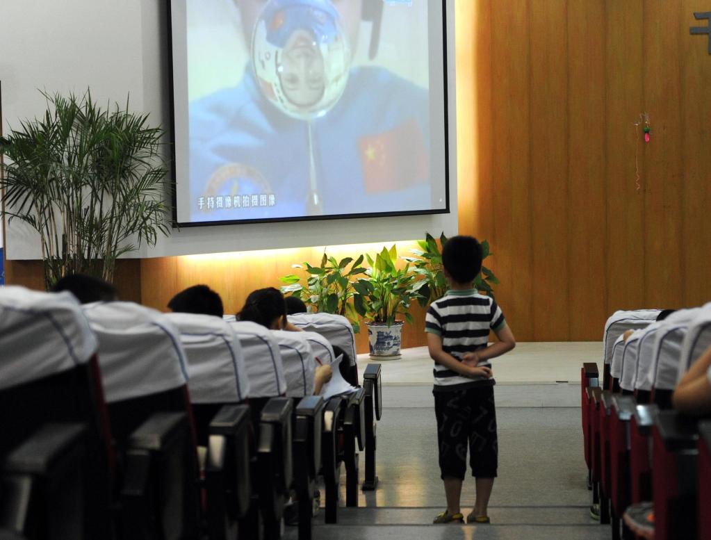 2013年6月20日,杭州保俶塔实验学校的一位小学生站在走道上观看太空授课。当日,神舟十号航天员在天宫一号开展基础物理实验,为青少年进行太空授课,全国8万余所中学6000余万名师生同步收看。(新华社记者鞠焕宗 摄)