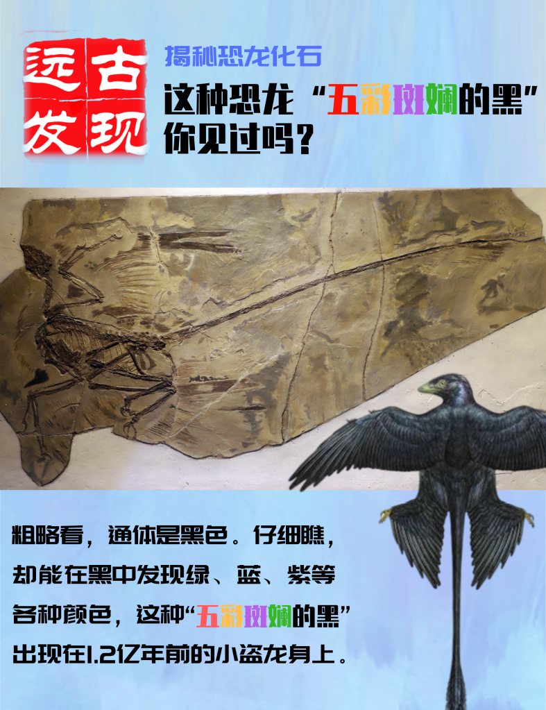 粗略看,通体是黑色。仔细瞧,却能在黑中发现绿、蓝、紫等各种颜色,呈现金属光泽。这种“五彩斑斓的黑”出现在1.2亿年前一种带羽毛的肉食性恐龙——小盗龙身上。科学家是怎么知道小盗龙的颜色的?近日,记者在中科院古脊椎动物与古人类研究所见到两位研究人员,他们揭晓了问题的答案。